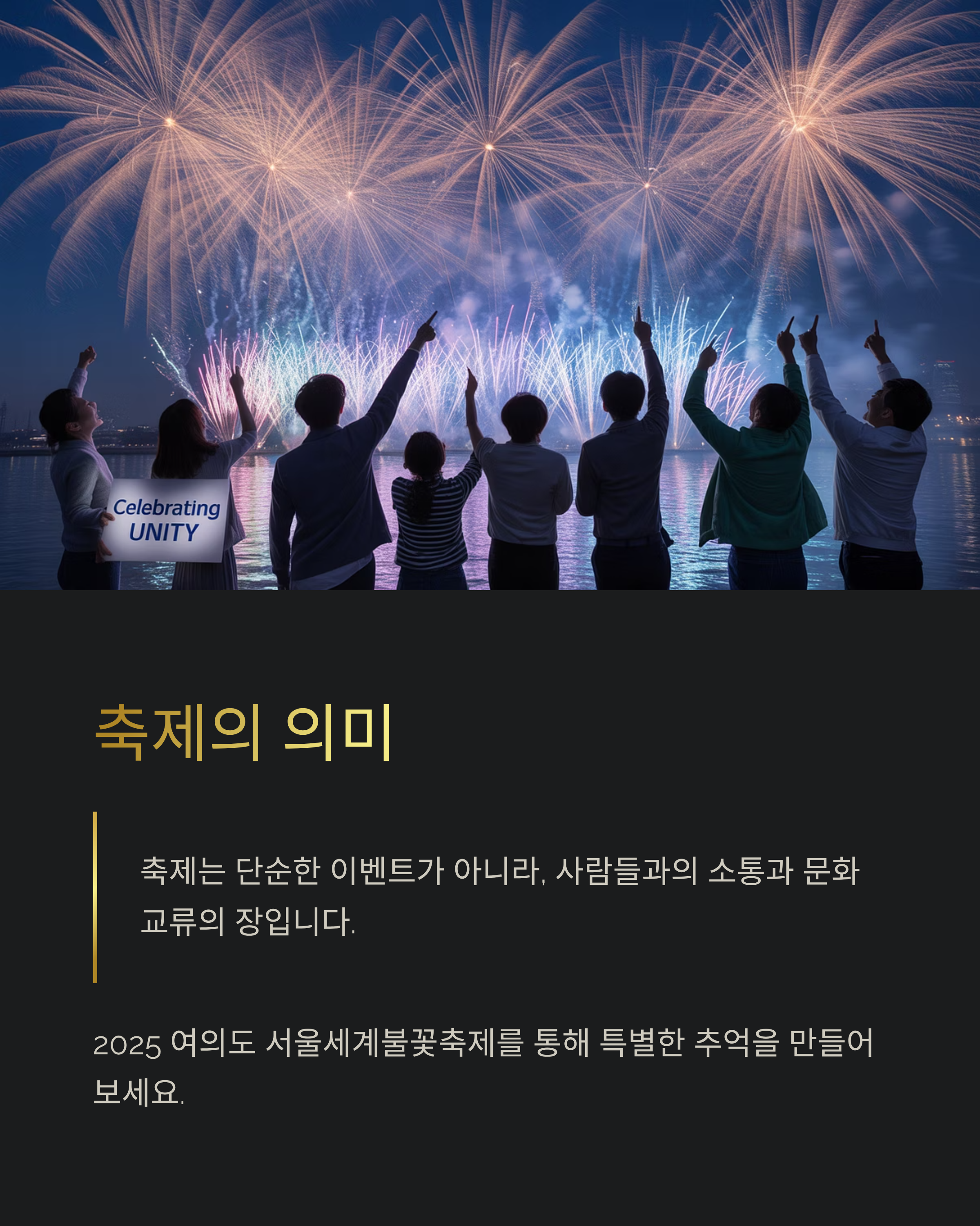 축제는 단순한 이벤트가 아니라, 사람들과의 소통과 문화 교류의 장입니다. 2025 여의도 서울세계불꽃축제를 통해 특별한 추억을 만들어보세요.
