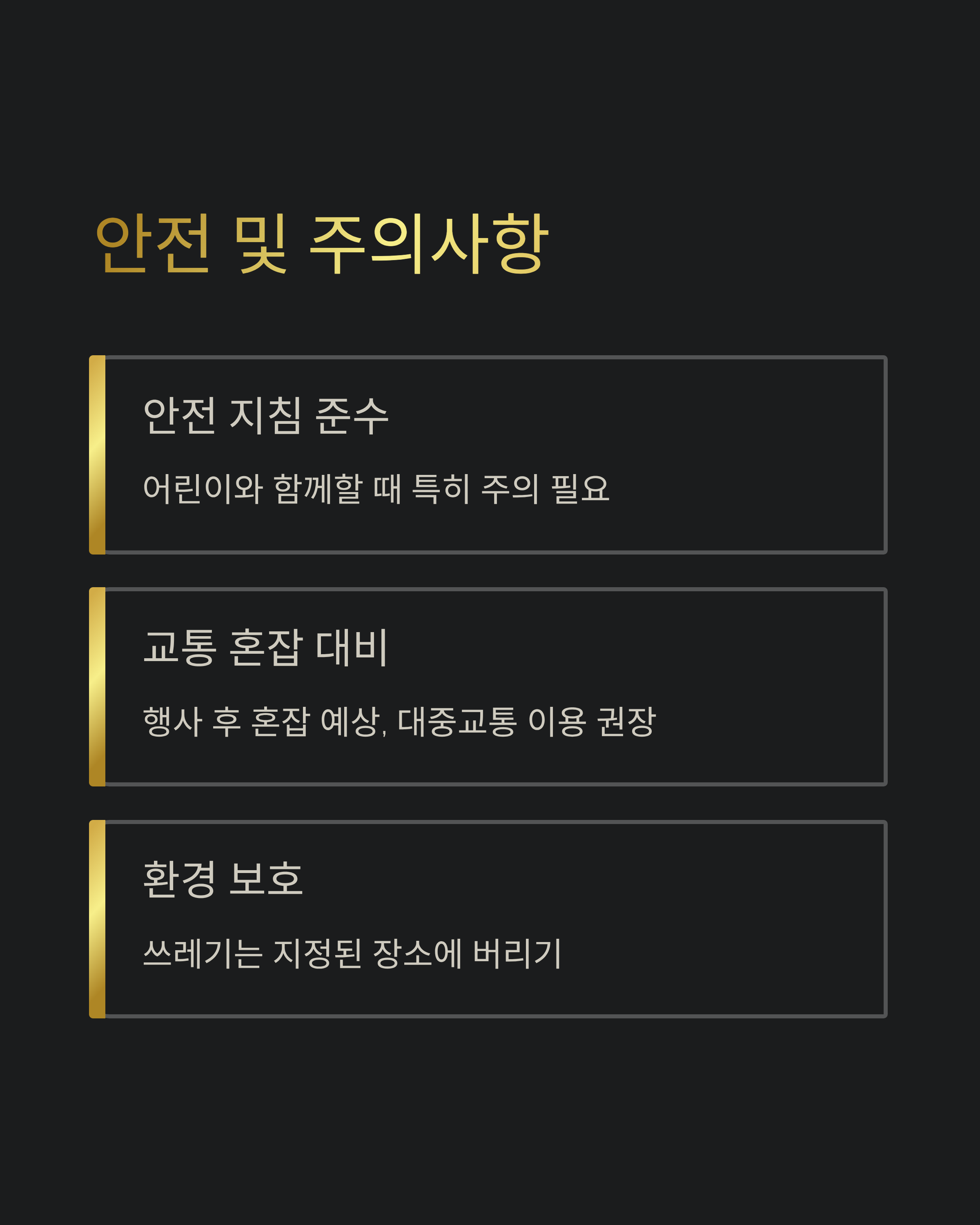 - 교통 혼잡 : 행사 종료 후 교통 혼잡이 예상되므로 대중교통 이용을 권장합니다.